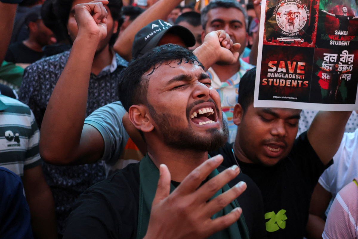 Demonstrators shout slogans after they have occupied a street during a protest demanding the stepping down of Bangladeshi Prime Minister Sheikh Hasina, following quota reform protests by students, in Dhaka, Bangladesh, August 4, 2024. REUTERS/Mohammad Ponir Hossain