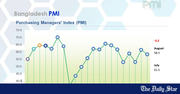 The index stood at 58.3 in August, down 3.2 points from July, according to the latest report by the Metropolitan Chamber of Commerce and Industry, Dhaka (MCCI), and Policy Exchange Bangladesh (PEB).