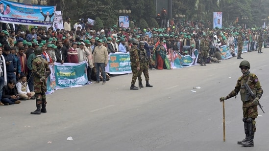 Bangladesh news LIVE: Bangladesh Army soldiers stand guard next to supporters of the Bangladesh Nationalist Party (BNP) for Tarique Rahman’s homecoming