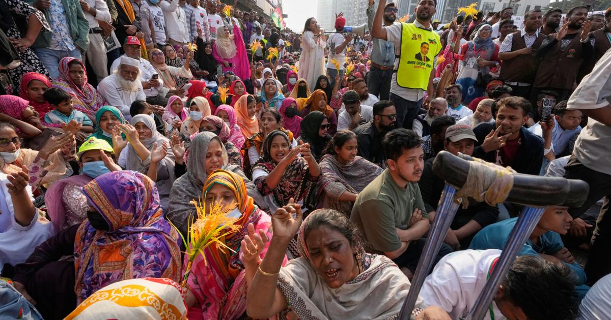 Supporters cheer as Tarique Rahman, the son of former Prime Minister Khaleda Zia and chairman of the Bangladesh Nationalist Party (BNP), addresses supporters during an election rally ahead of national election, on a road in Dhaka, Bangladesh, Sunday, Feb. 8, 2026.