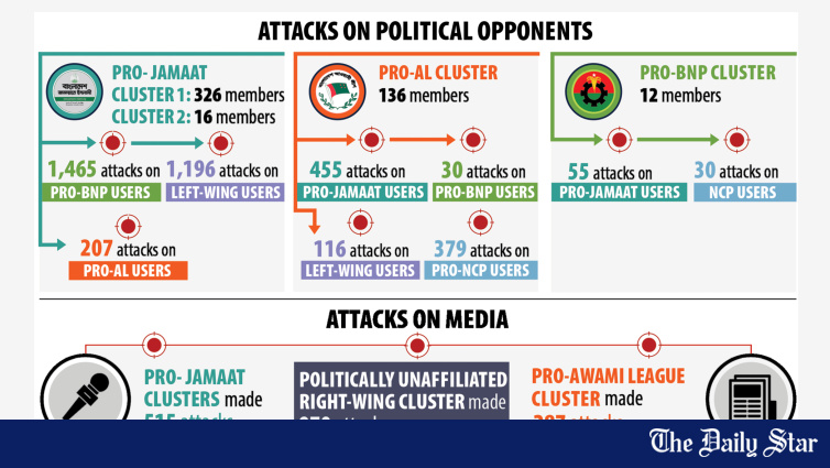 Two of these clusters appear aligned with Bangladesh Jamaat-e-Islami, while one each is aligned with the Bangladesh Nationalist Party (BNP) and the ousted Awami League. However, no official links with any of the party were investigated.