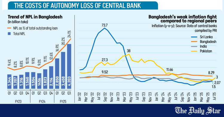 The rise in non-performing loans, red-hot inflation, illicit fund flows and lately an uptick in the poverty rate are the direct outcomes of the Bangladesh Bank (BB) losing its autonomy, according to economists.