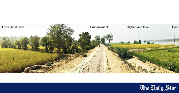 Permanent flood-protection embankments obstruct the process of monsoon borsha flooding. The construction of coastal embankments in Bangladesh during the 1960s prevented the 1.5 billion tons of sediment that pass through the Bengal delta each year from depositing on the floodplains during the monsoon. Instead, the silt clogs up the rivers and raises the riverbed levels outside the embanked floodplain (Brammer 2014; Hossain et al. 1987). This difference in elevation traps the heavy monsoon rainwater inside the embankment, as it can no longer drain out to the rivers.
