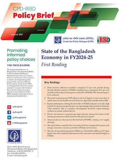 Total revenue collection recorded a marginal 3.7 per cent growth during the July-October period of FY2025, implying that a whopping 45.1 per cent growth will be required during the remainder of FY2025 if the annual target is to be achieved. The point-to-point general CPI inflation rate was higher in rural areas than in urban areas for 16 months out of 21 between April 2023 and December 2024. Export performance during the first half of FY2025 indicates not only high growth of export earnings but also correspondingly high growth of domestic value retention. This is a positive development; however, export earnings continue to remain volume-driven. Private investment is experiencing major disarray during the tenure of the interim government, which started in the previous regime. Aman production decreased in the first half of FY2025, creating a rice supply shortage. The spiral effect caused by the ever-rising debt has entrapped the power and energy sector into a vicious cycle that will likely not end soon. The size of non-performing loans (NPLs) as of September 2024 was 2.7 times higher than the combined allocation for the education and health budget in FY2024.